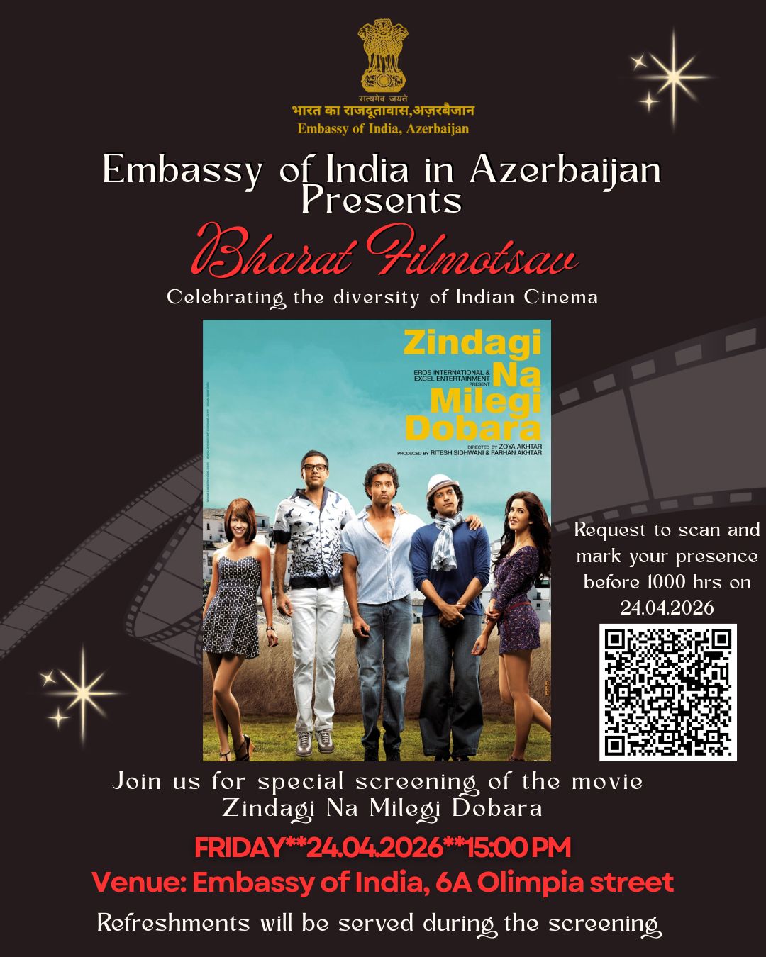 The Embassy of India in Baku organized a special free screening of the popular Bollywood film Zindagi Na Milegi Dobara on Friday, 24 April 2026, as the fourth movie under the Bharat Filmotsav initiative, which is being held as part of the Embassy’s popular #BakuEvenings cultural outreach series.
